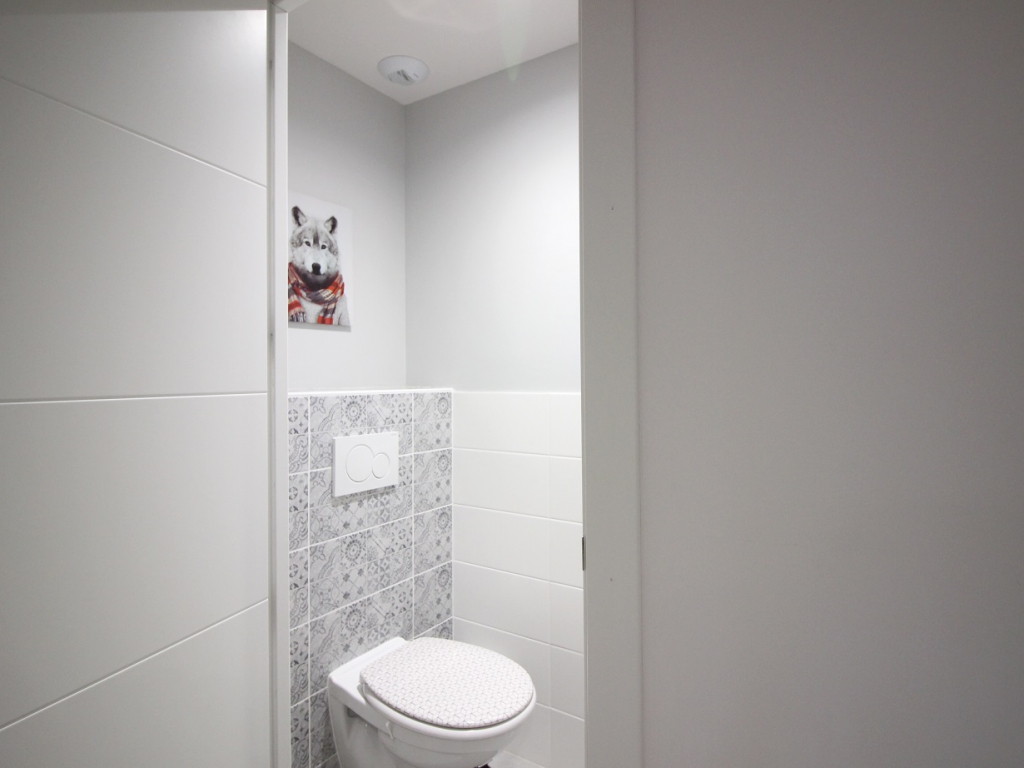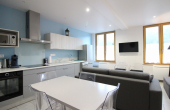 Il se compose d'une pièce à vivre avec cuisine équipée comprenant plaque vitrocéramique, hotte, four, micro-ondes, réfrigérateur grand modèle avec congélateur, lave-vaisselle....