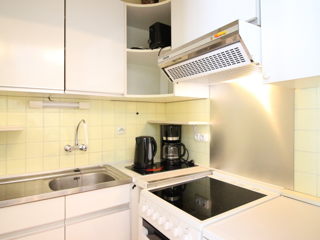 Une kitchenette équipée avec plaque vitrocéramique 4 zones, hotte, four, réfrigérateur grand modèle avec congélateur, lave vaisselle, micro-ondes...