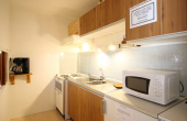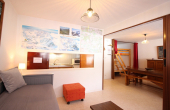 L'appartement situé au rez-de-chaussée se compose d'un séjour comprenant un canapé convertible en 140, Une cuisine équipée indépendante avec 4 plaques électriques, hotte, four, réfrigérateur top, lave vaisselle, micro-ondes...