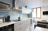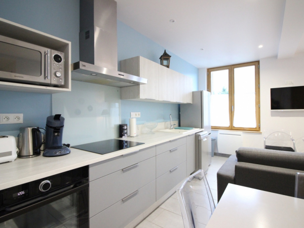 Il se compose d'une pièce à vivre avec cuisine équipée comprenant plaque vitrocéramique, hotte, four, micro-ondes, réfrigérateur grand modèle avec congélateur, lave-vaisselle....