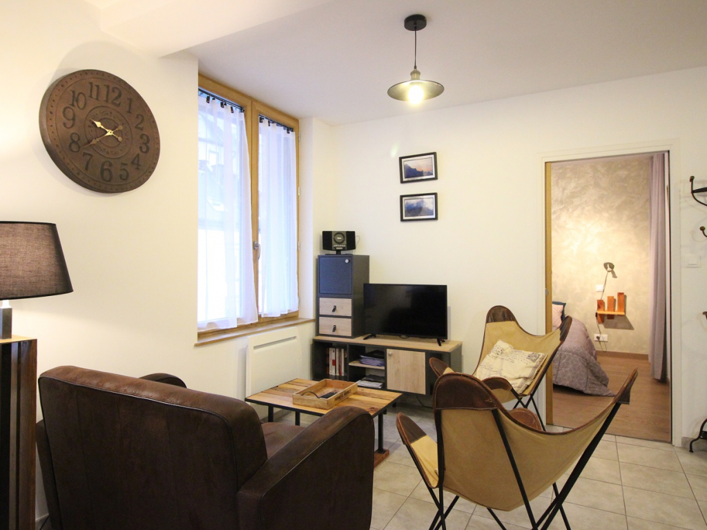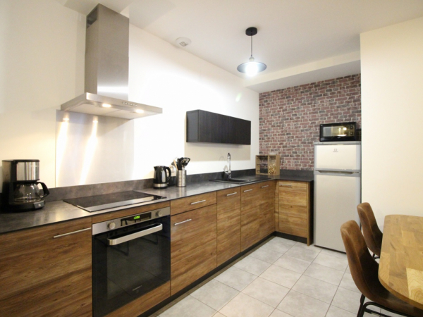 Au 3ème étage avec ascenseur, l'appartement se compose d'une pièce à vivre avec cuisine équipée comprenant plaque induction, hotte, four, micro-ondes, lave-vaisselle...