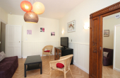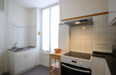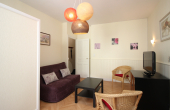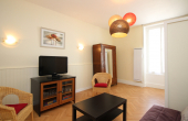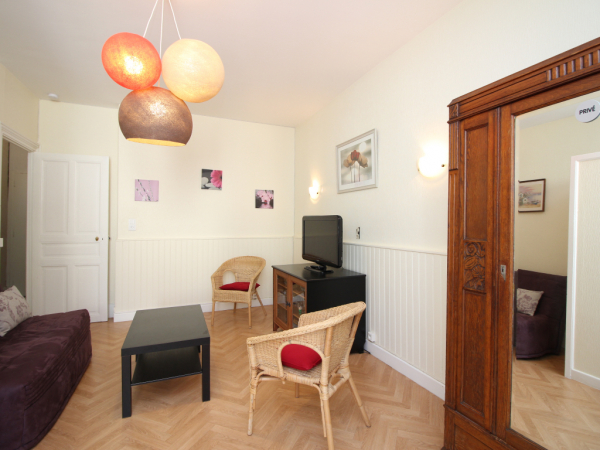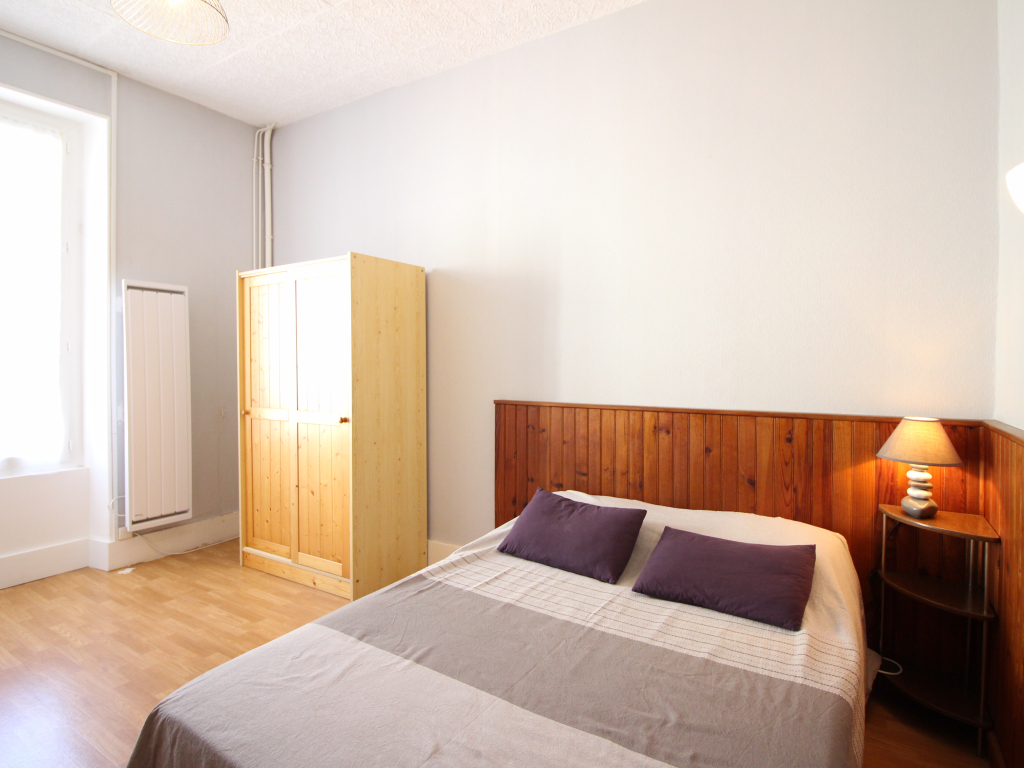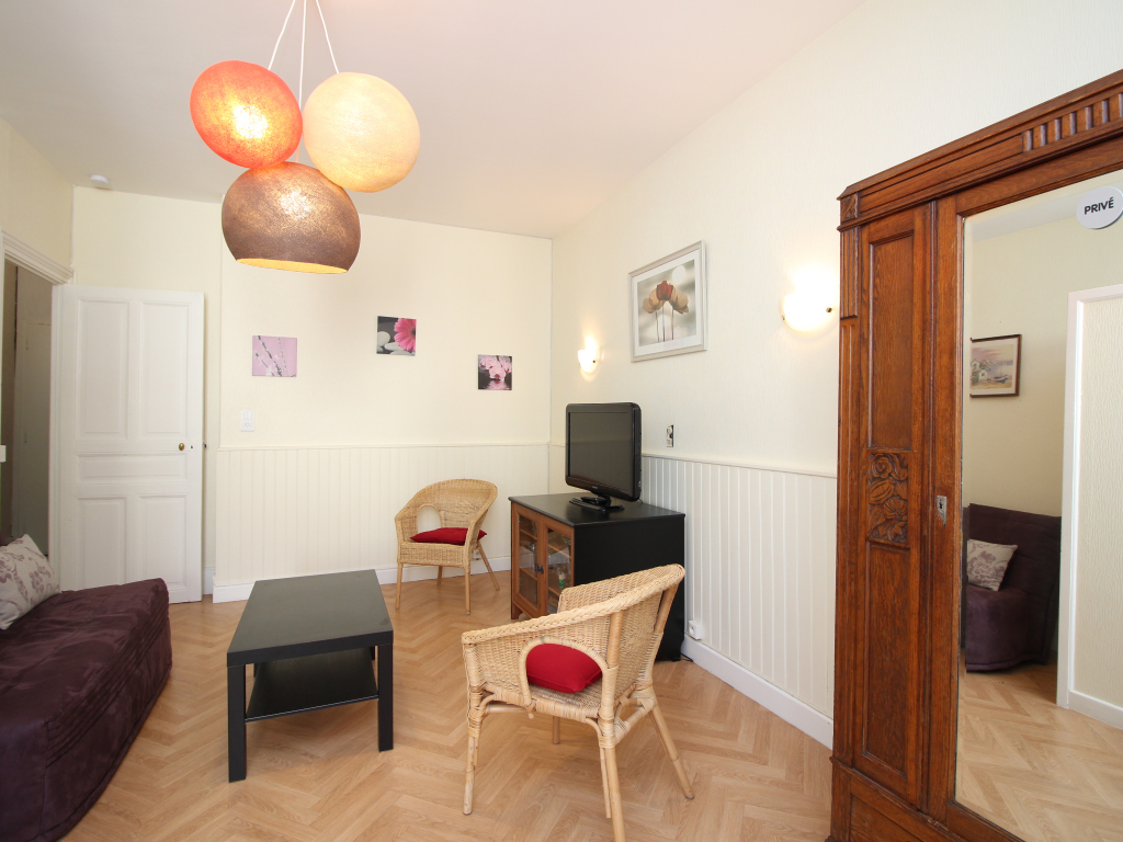 Au 1er étage sans ascenseur, appartement de 45m² comprenant un séjour avec un BZ convertible en couchage 130x190 et cuisine équipée d'une cuisinière avec plaque induction 4 zones et four, hotte, réfrigérateur, micro-ondes... ouvrant sur une terrasse et un petit jardinet.