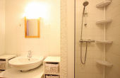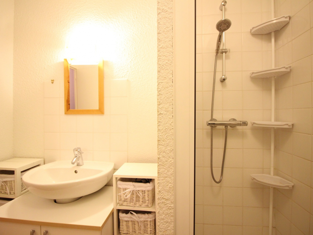 Une salle d'eau (douche) avec sèche-serviettes et lave-linge.